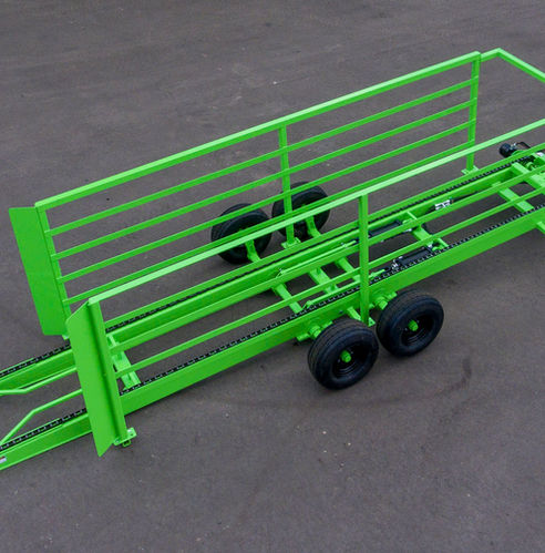 The S&S Foxtrot Bin Trailer allows a smooth and delicate way to transfer bins and totes in and out of the field. The Foxtrot Hydraulic Self Loading Bin Trailer utilizes the hydraulics from your tractor, allowing the control of lowering the axles and pitching the tongue, creating a low approach angle. The Foxtrot comes equipped with Tor-Flex axles, heavy duty bin chain's, inner bin guides, bolt-on outer bin rails and operator hydraulic valve. Bolt-on Tote side rails also available.